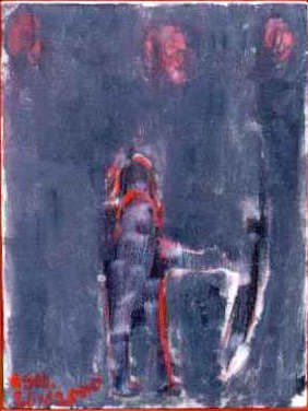 The exhibition opened on 2nd February, ran for two weeks and included three Saturday evenings of poetry, dance, song and performance art. Grace showed a selection of small (A4) ink-on-paper pieces she had produced in Ainaro town and in Dili since her arrival in East Timor in October 2001. Due to the high local cost of labour and materials, she decided to have all the pieces laminated instead of using traditional frames. She then hung them with bulldog clips from a fishing line. The effect was rather like a washing line. Behind the `washing line' she hung as a backdrop a huge piece of white cotton cloth she had brought from Jakarta. She also showed two large (2m X 1m) oil-on-plywood paintings she made whilst in Dili. Grace's pieces were hung on the right as you entered the space, while Abe's poems in three languages (the original Indonesian, with Tetum and English translations) with illustrations by his younger brother, were hung on the left. Grace's ink-on-paper pieces were very simple, some black and white and others using only red, purple, blue and black. Some were self- portraits, many showed figures of various kinds and others where entirely abstract explorations of colour. On the three evenings, Grace performed acapella Batak traditional songs and the Batak ritual dance, the Tor-Tor. The Tor-tor she danced, (accompanied by a recording of `Gondang', the traditional Batak music form), was one that is used to bless journeys and ceremonies. Each time she sang and danced the audience was completely silent and engrossed in the atmosphere of a culture from the far end of the archipelago. When she sang, some of the audience weeped. Without understanding the lyrics, something in the music touched them: possibly that ancient melancholy that is the flip side of the famous Batak rough-and-readiness. Each evening, Abe read his poems -mainly themed around the Timorese struggle- with passion and dignity. On the second and third of the three Saturday evening events, she also presented her first ever piece of performance art. Grace was inspired by the Jakarta Performing Arts Festival at Komunitas Utan Kayu in Jakarta, where she saw performance artists from all over the world. |