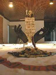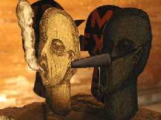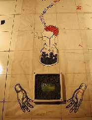 They simply just prove that one doesn’t need `funding` to make good theatre. It comes from the desire and dedication to do so and it would be great to have them come out to Australia some time and get people who complain about the lack of funding here to get up do something, create work that is worth funding. Following the performance in Ubud, they then did it again in Denpasar before heading home to Bandung via a gig in Malang. In early February there was a short story conference held in Negara (I had turned up to it by accident thinking it was a theatre event). The event was closed with a colossal performance by Nyoman Erawan – a cast of thousands supporting music, images, installation, and poetry all by Nyoman Erawan. So much for the artist doing for the art and not for the ego. There were some great moments but by the tenth slide projection of Erawans face I think I was suffering Erawan poisoning. It was a classic example of lots of money ( the cast of thousands and special effects) and not much thought. | ![]() |